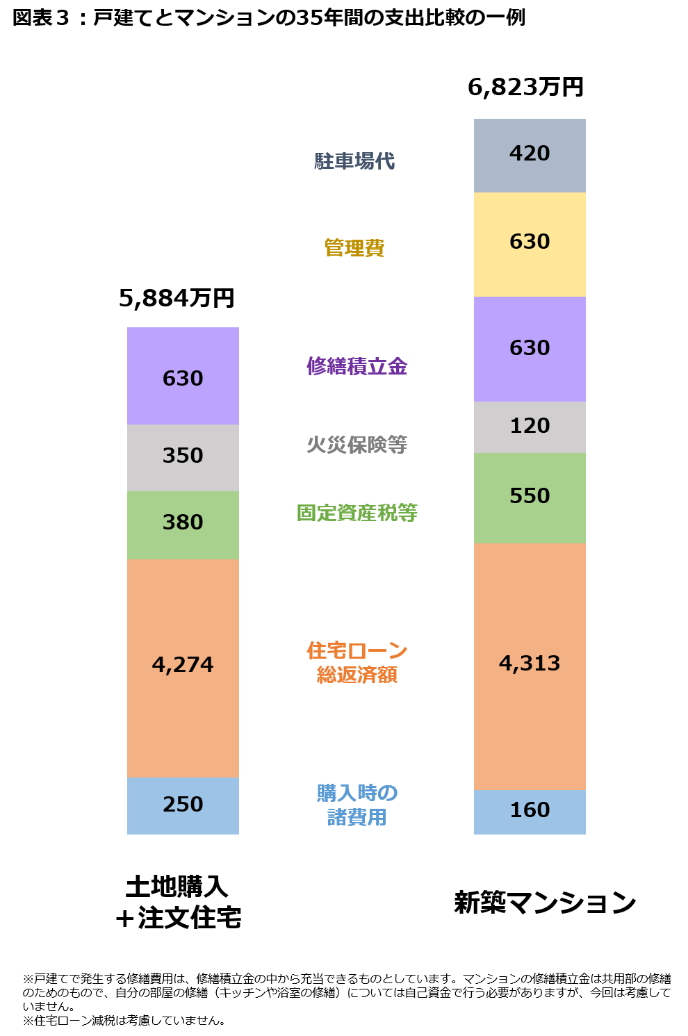 ここで「土地を購入して注文住宅を新築する」場合と「新築マンションを購入する」場合とを比べ、35年間で、どれくらいお金面の差が出るかを検証します(図表3)。新築マンションの価格は4,000万円、注文住宅では土地を1,500万円で購入し、2,500万円の注文住宅を建てる(合計4,000万円)としています。