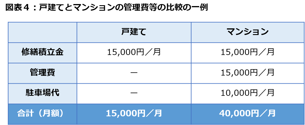 住宅購入後、マンションでは管理費、修繕積立金、駐車場代が必要になります。戸建てでは管理費や修繕積立金は発生せず、駐車場代も一般的には不要です。ただし戸建てでも、将来のリフォームに備えて、少しずつお金を貯めていく必要がある(自分自身で修繕積立をしていく必要がある)という点は注意したいところです。図表3の例で使った、修繕積立金などの数値は図表4のとおりです。