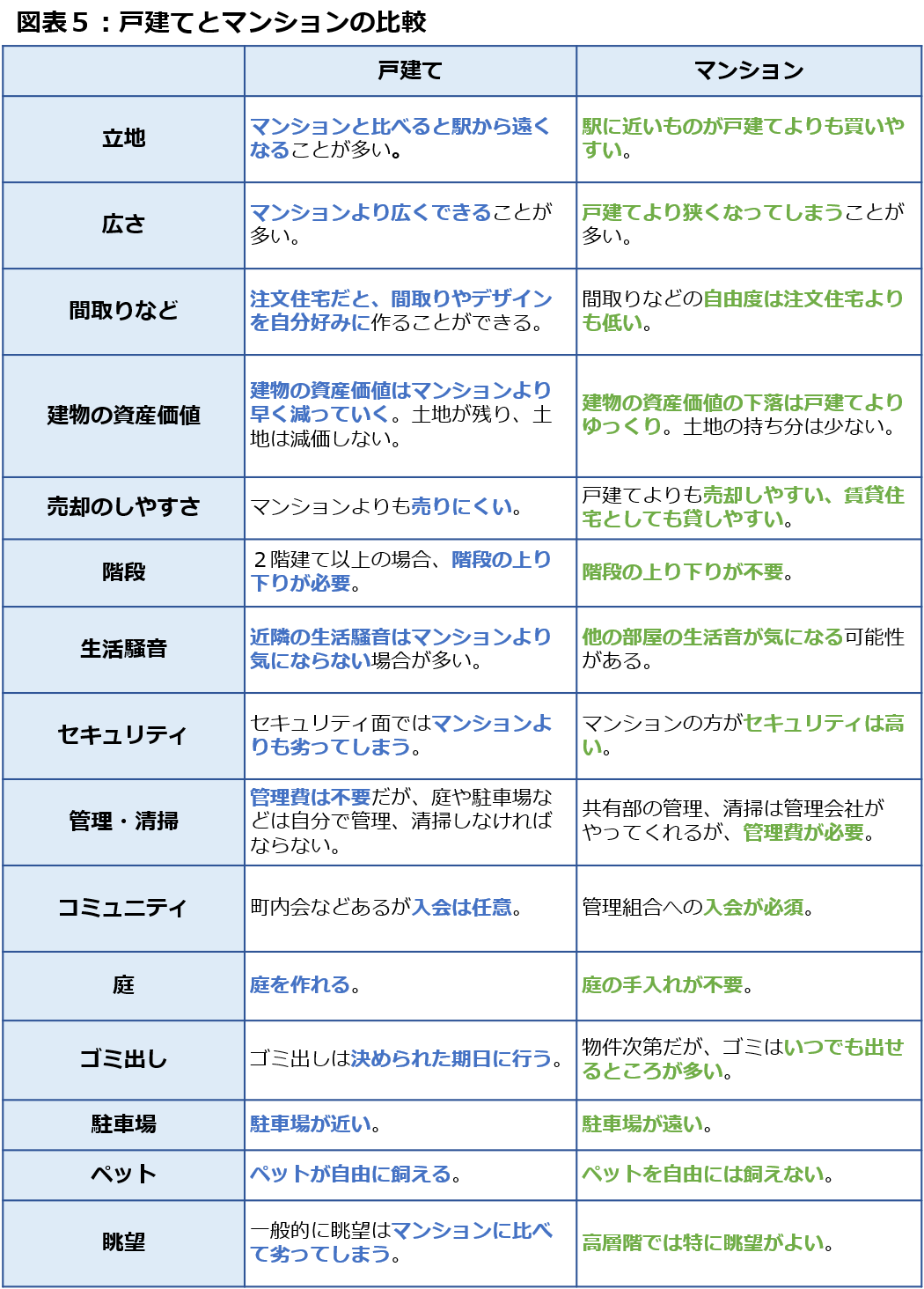 最後に、戸建てとマンションをお金の面以外でも比較します。それぞれの主な特徴をまとめると図表5のようになります。