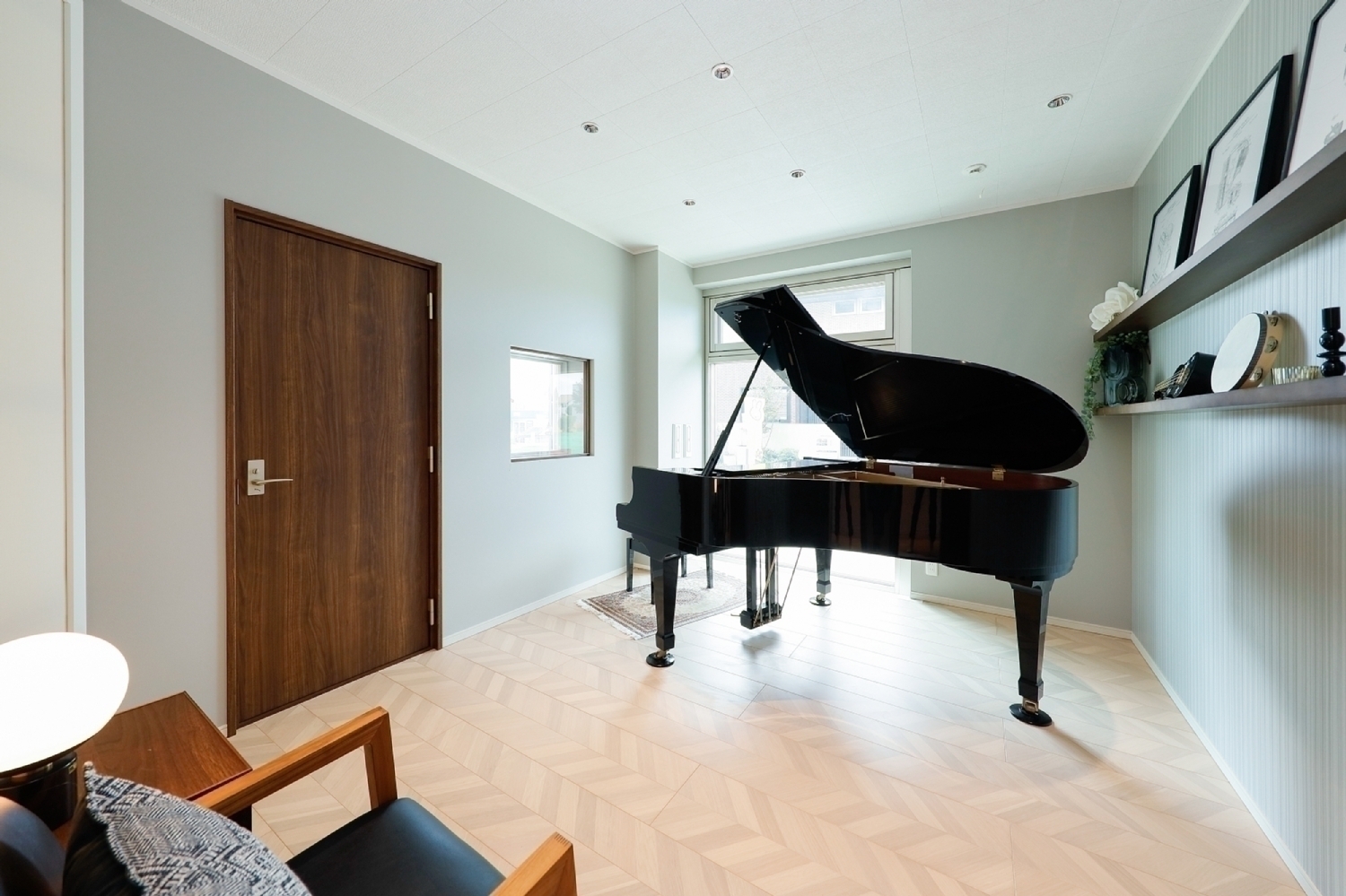 重量鉄骨造3階建て、1階にはボダムカフェ、2階には1LDKの賃貸部を設けた、店舗・賃貸併用住宅をご体感いただけます。その他1階の防音ルームにはグランドピアノを設置。3階のご自宅スペースではワイドスパンを活かしたパノラマビューも見どころです。2階建てのご相談も承っております。