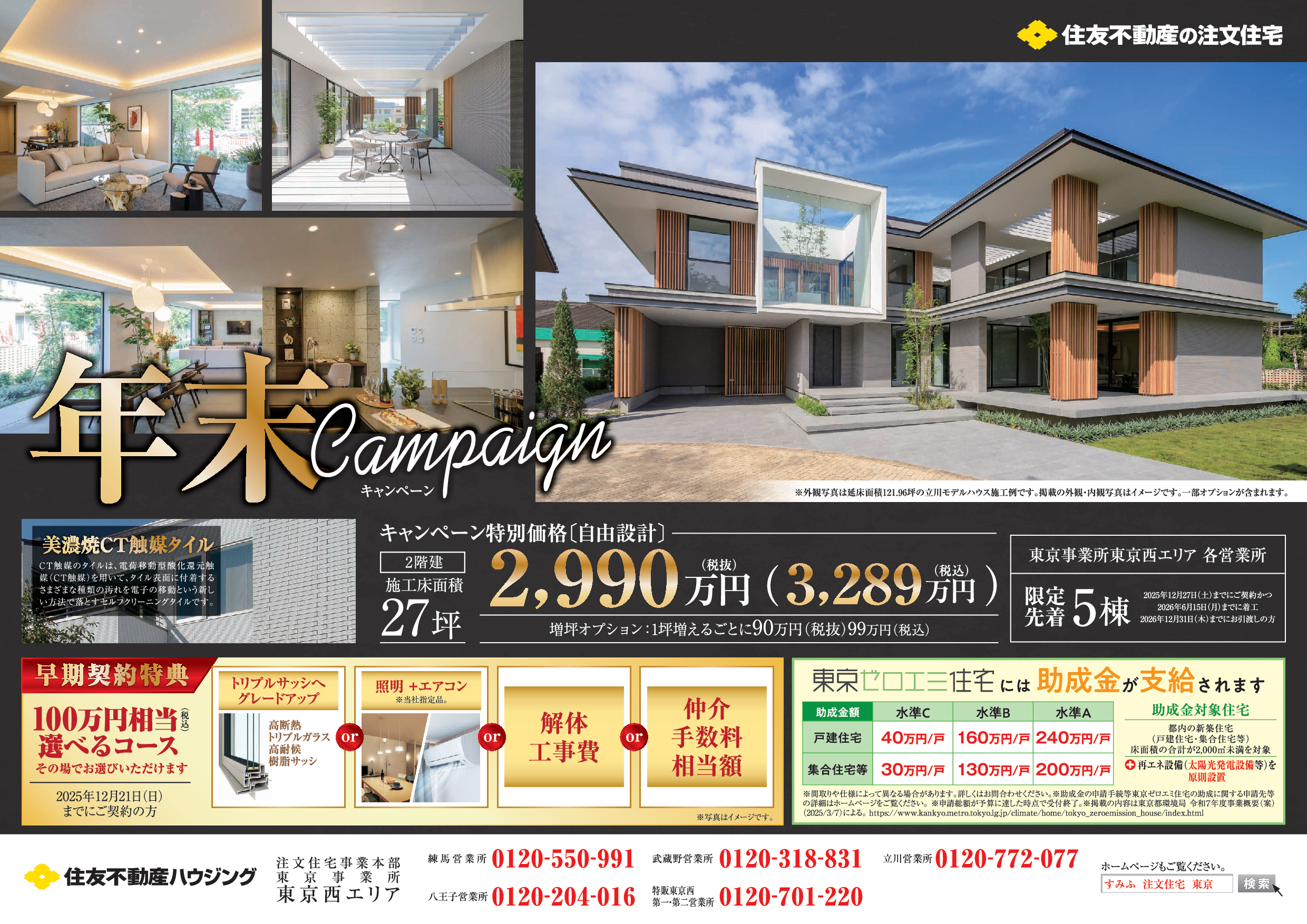 2025年12月27日(土)までにご契約かつ2026年6月15日(月)までに着工、2026年12月31日(木)までにお引き渡し可能な方へ、特別価格をご用意いたしました。