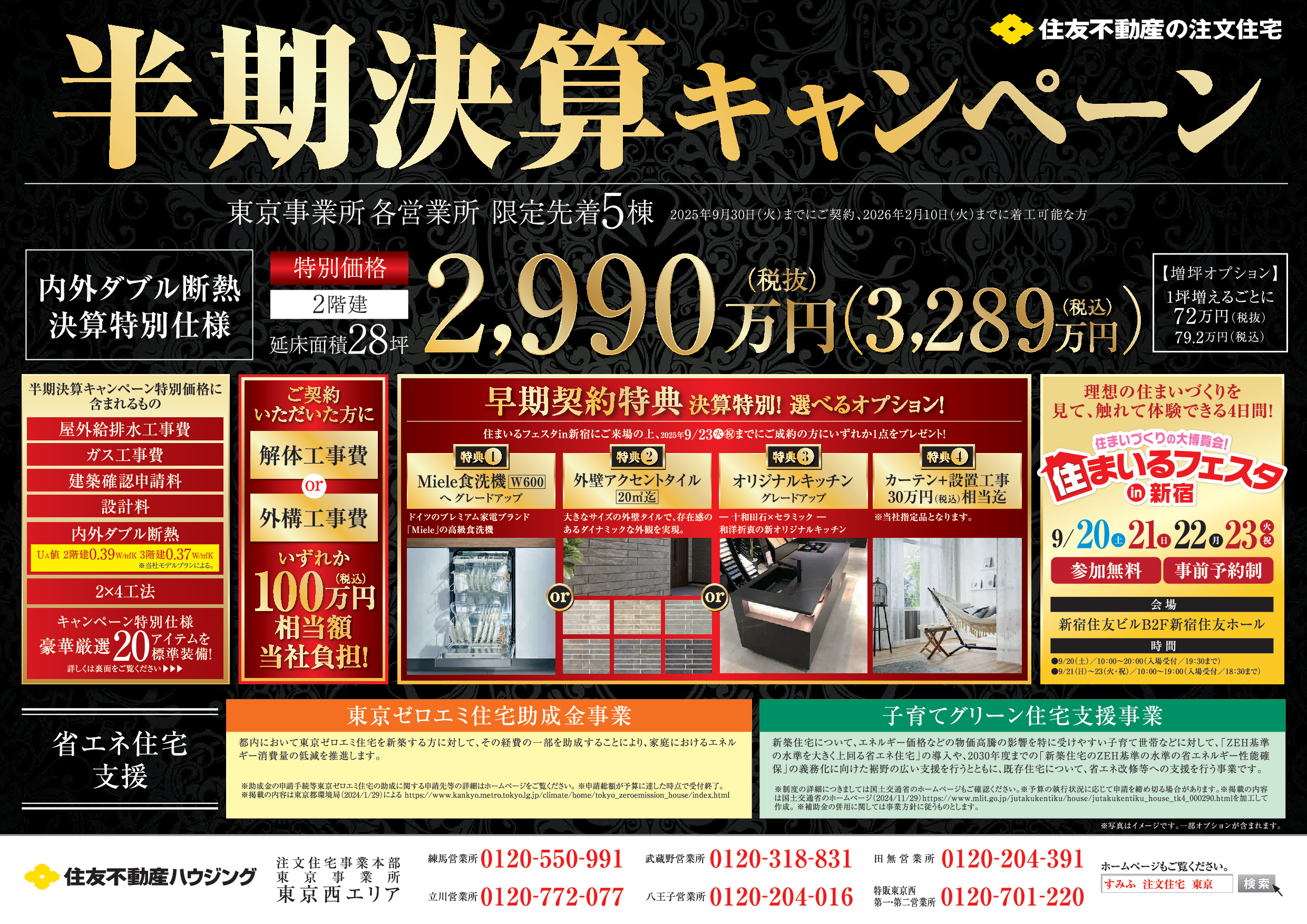 また、9月20日(土)・21日(日)・22日(月)・23日(火・祝)に開催される住まいるフェスタin新宿にご来場の上、2025年9月23日(火・祝)までにご成約の方に、早期契約特典として、選べるオプションをご用意しております!