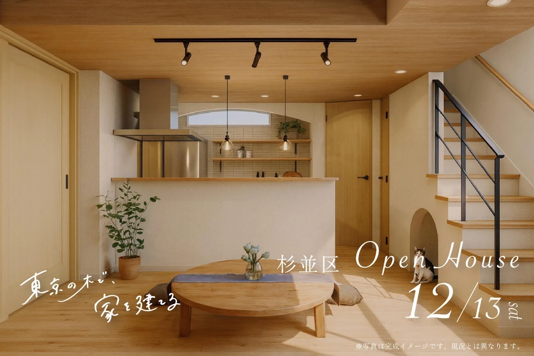 杉並区で「TOKYO WOODの家」完成見学会を開催します。天然乾燥の多摩檜や無垢材の心地よさ、ソーラーサーキット工法ならではの快適性を体感できる機会です。広い土間や開放的な空間でも季節に左右されにくく、ご家族もペットもゆったり過ごせる住まい。ぜひこの機会に、現地で心地よさを感じてみてください。